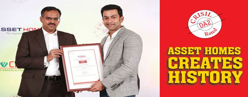Asset Homes is the first builder to get DA2 rating within 8 years since inception and one of the first in South India, apart from Prestige Estates Projects Limited from Karnataka who received DA1. Actor Prithiviraj, new brand ambassador of Asset homes, received DA2 rating citation from Sudhir Nair on behalf of Asset Homes.
