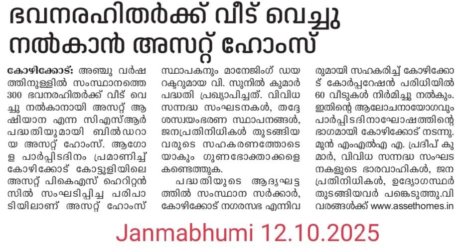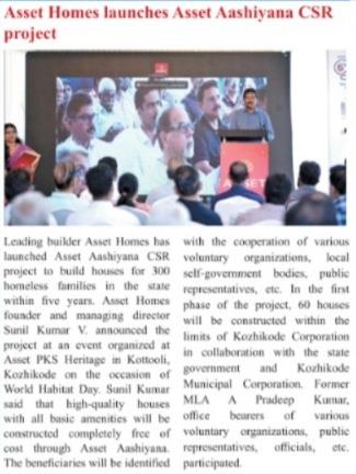 Asset Homes has announced Asset Aashiyana, a major CSR initiative dedicated to providing homes for 300 homeless families across Kerala within five years. Asset Homes has announced Asset Aashiyana, a major CSR initiative dedicated to providing homes for 300 homeless families across Kerala within five years. The project was unveiled by Mr. V. Sunil Kumar, Founder & Managing Director of Asset Homes, during Edam: World Habitat Day celebrations held at Asset PKS Heritance, Kottooli.