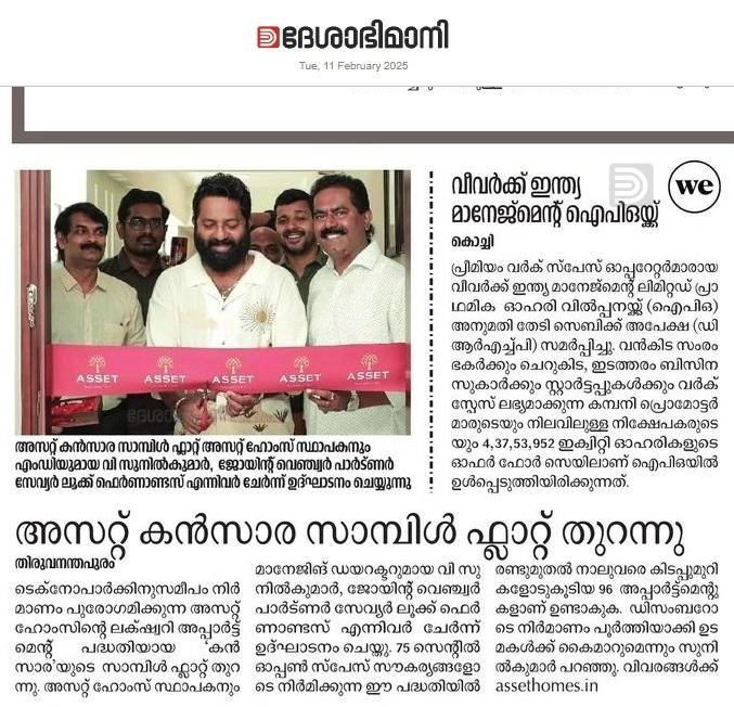 The project is scheduled for completion and handover by December 2025. Asset Homes, a trusted name in the real estate sector, has successfully completed 84 projects in the past 18 years. Currently, the company has 32 ongoing projects across nine districts in Kerala, further solidifying its reputation for delivering quality housing on time.