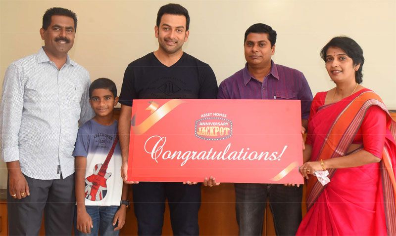 Asset Homes Anniversary Jackpot Winners Mr. Rajesh Pulikkal and Mini Rajesh along with Brand Ambassador Mr. Prithviraj and MD Mr. Sunil Kumar.