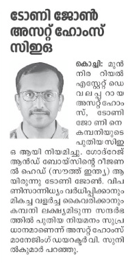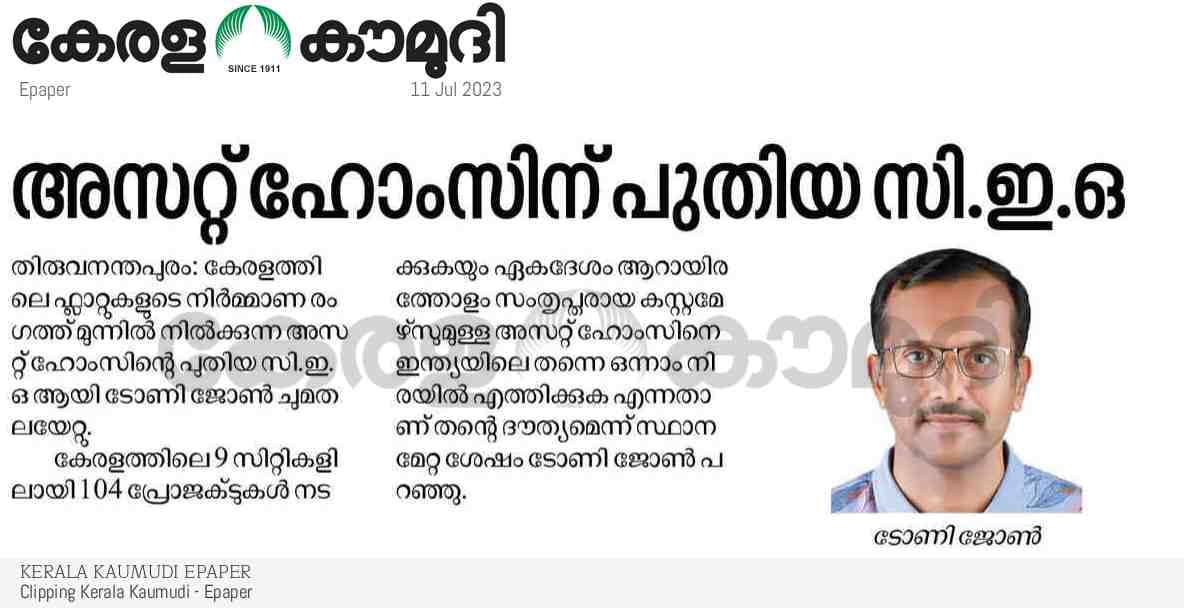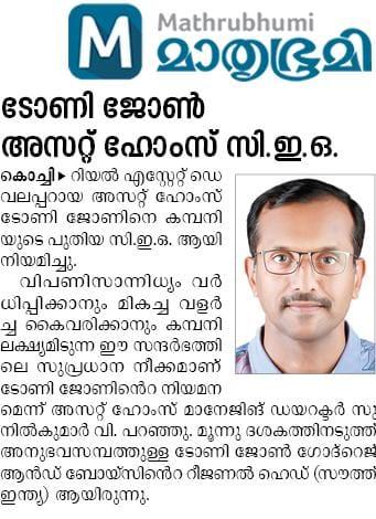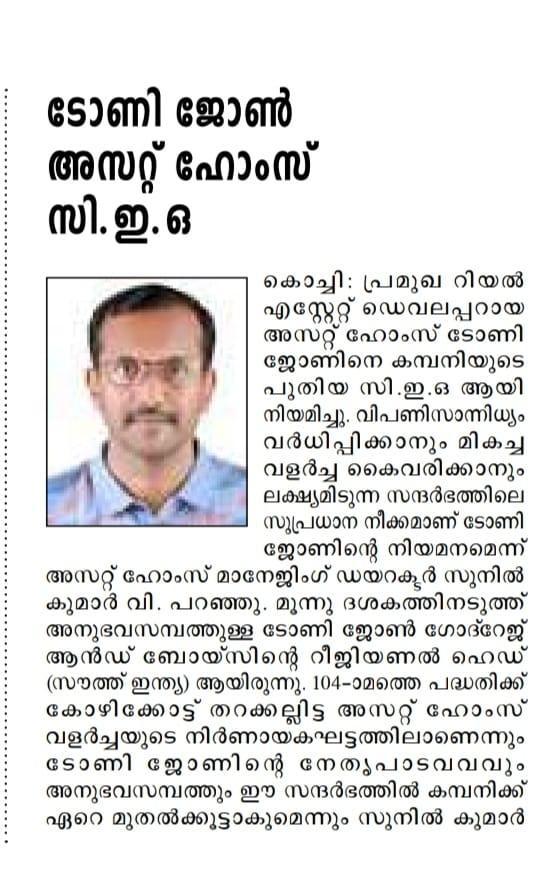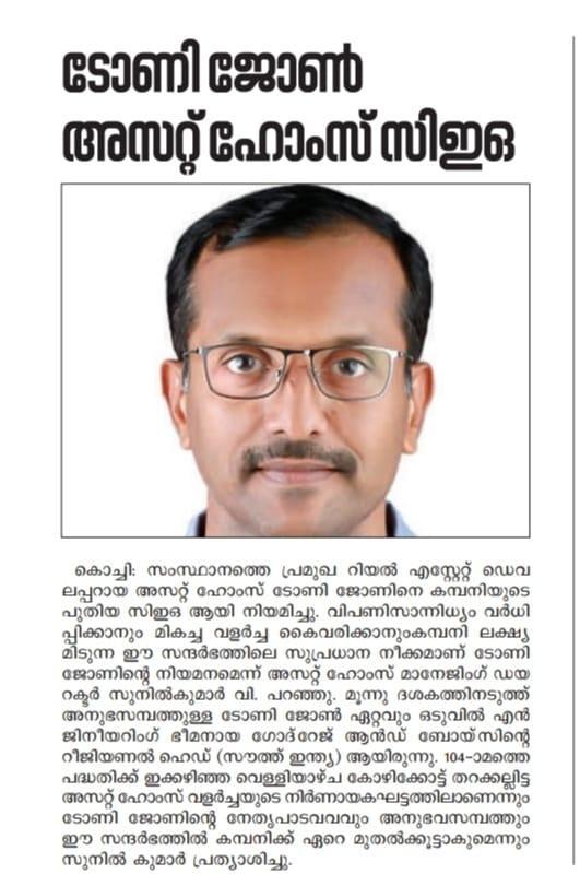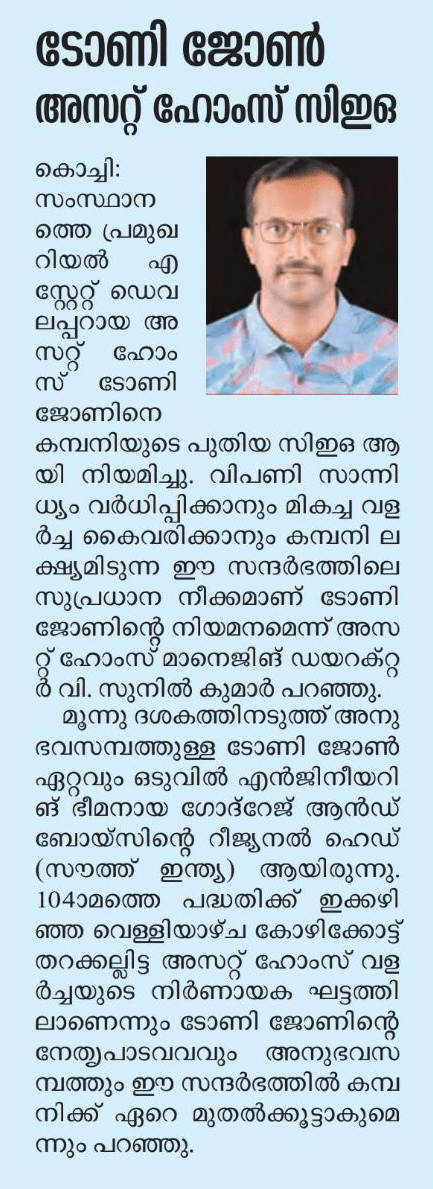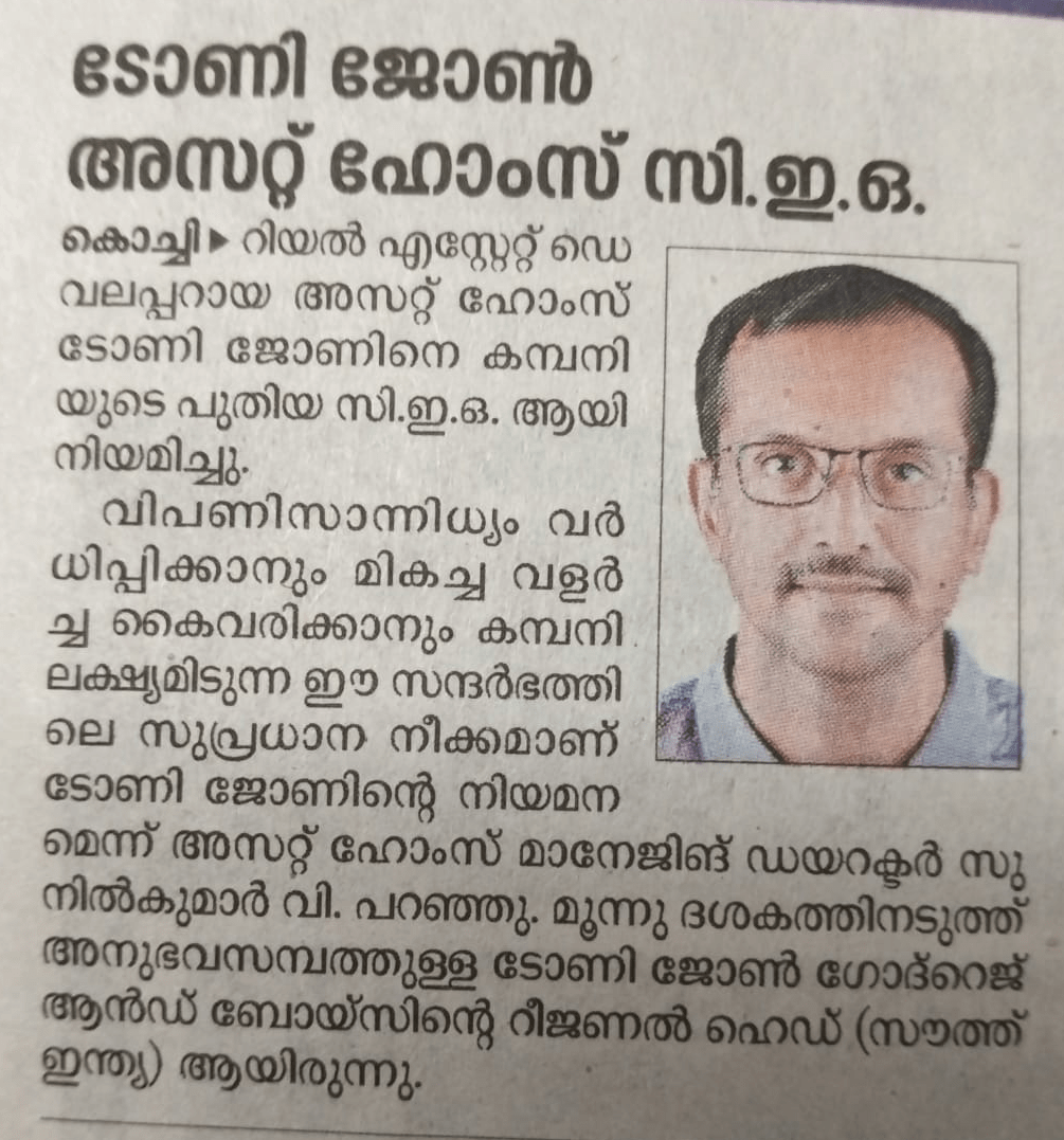 V. Sunil Kumar, Managing Director of Asset Homes, expressed his enthusiasm, stating, “We are thrilled to welcome Mr. Tony John as our new CEO. His visionary leadership will undoubtedly propel our company forward, allowing us to deliver exceptional value to our customers & stakeholders."
