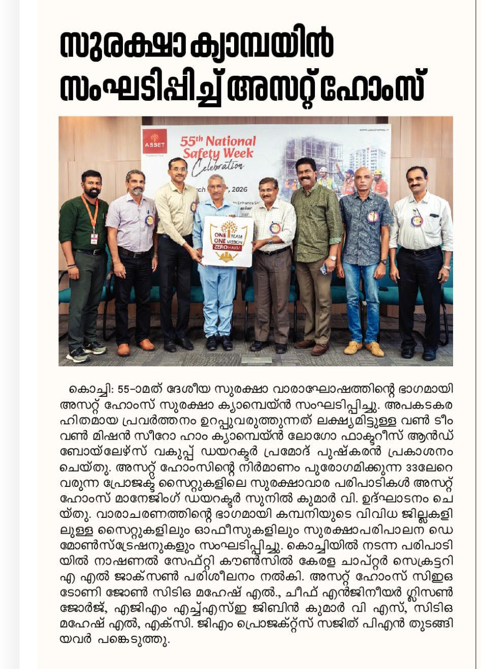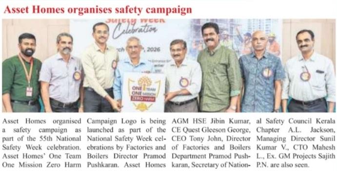 As part of the 55th National Safety Week celebrations, Asset Homes organized a comprehensive safety campaign. Aimed at promoting accident-free operations, the event was marked by the launch of the logo for Team One Mission Zero Harm campaign by Mr. Pramod Pushkaran, Director of Factories and Boilers (Kerala State).