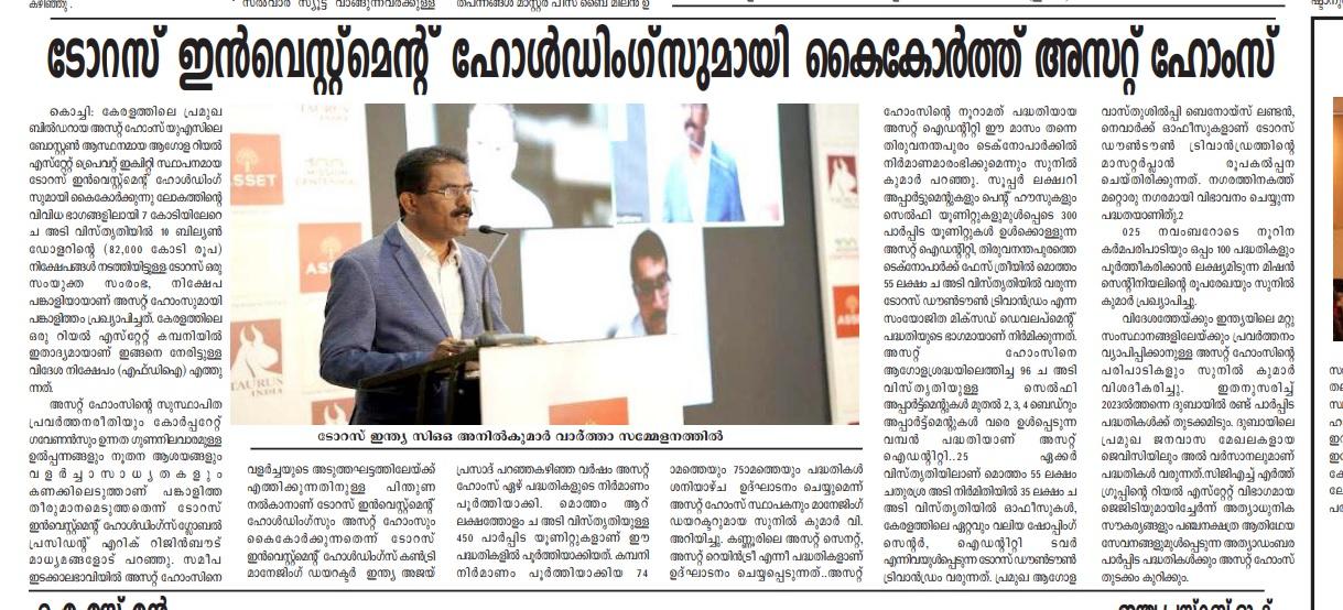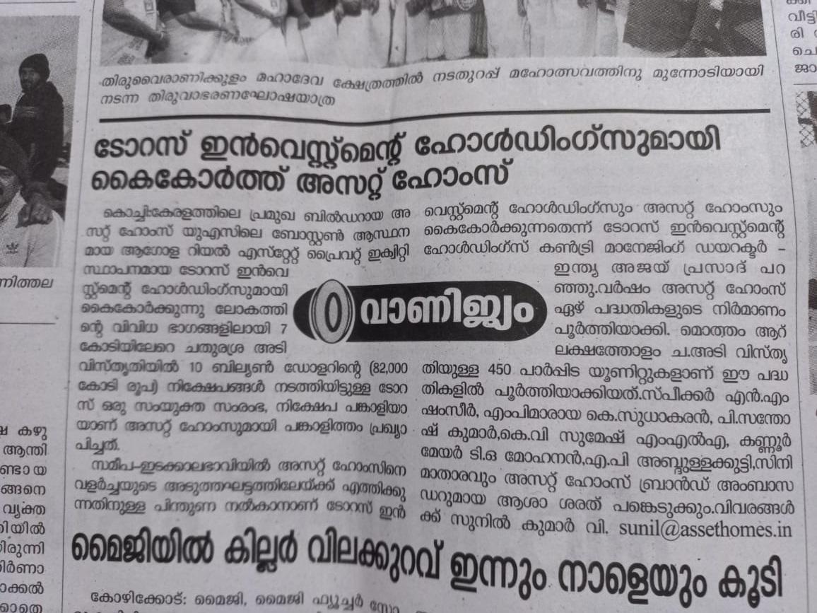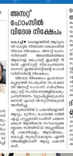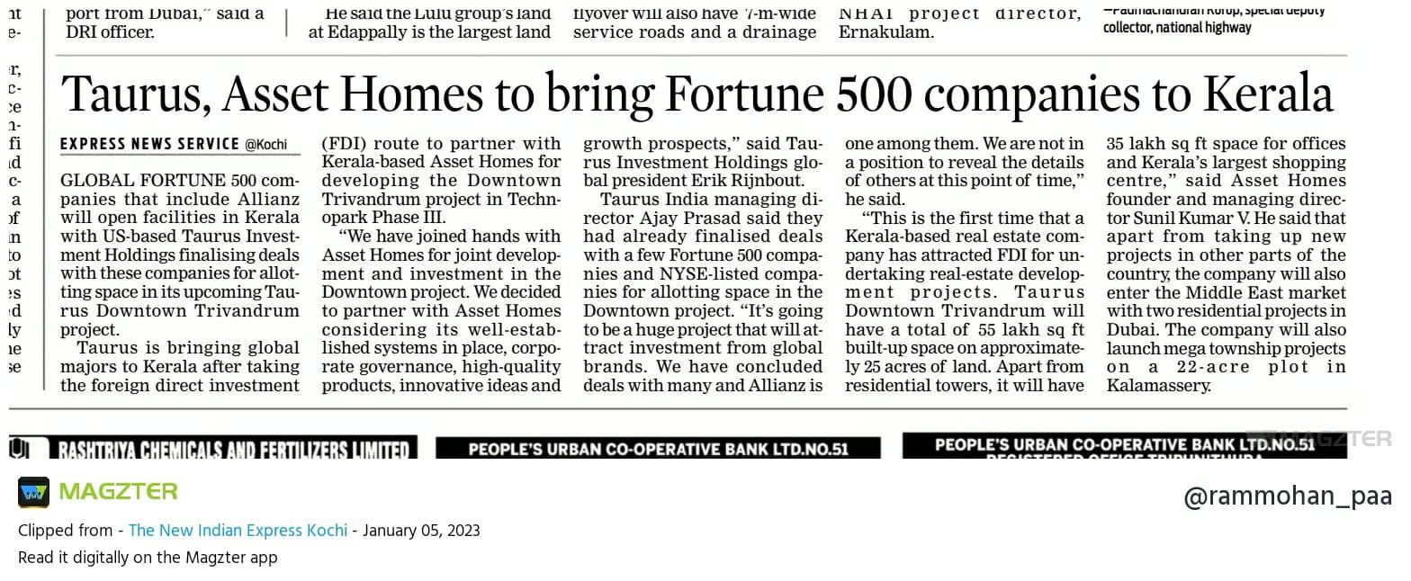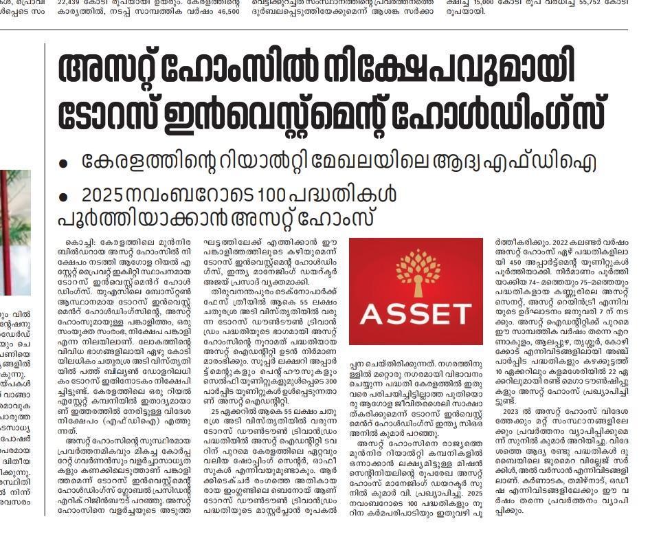 Asset Homes, the leading residential developer in Kerala, has formed a partnership with Taurus Investment Holdings, a global real estate private equity investment and development firm based in Boston, USA. Taurus, which has made over $10 Billion (INR 82,000 Crores) in investments spanning more than 70 million (7 Crore) square feet of assets across the world, has joined hands with Asset Homes both as a joint venture partner and investor. This is the first time that a Kerala-based real estate company has attracted foreign direct investment (FDI).