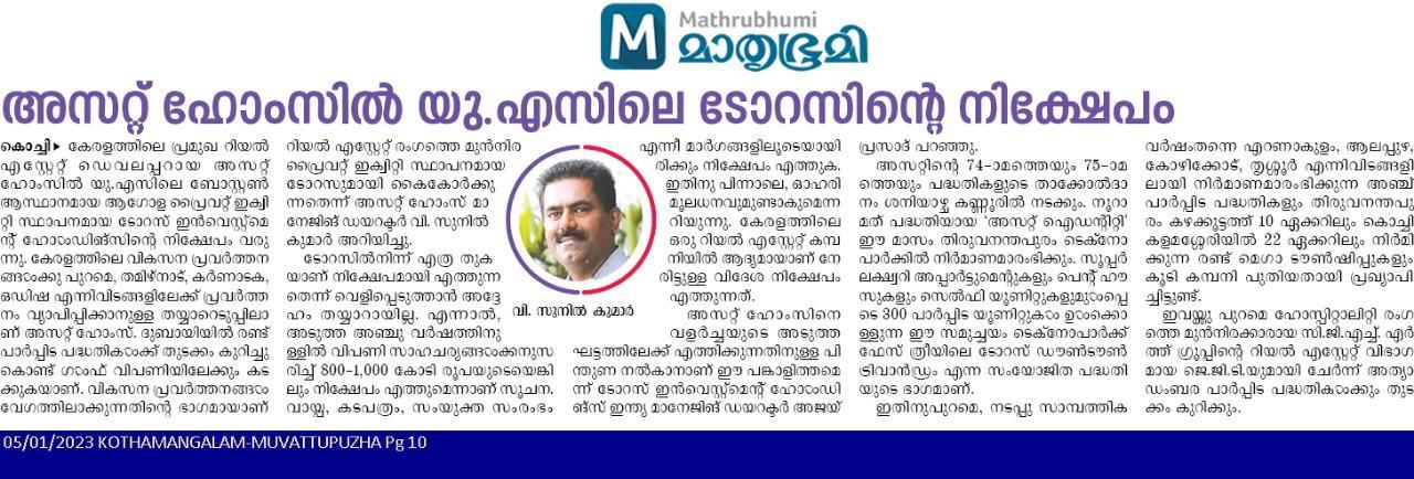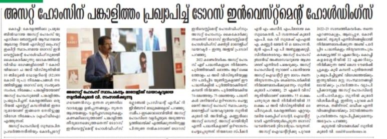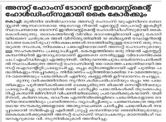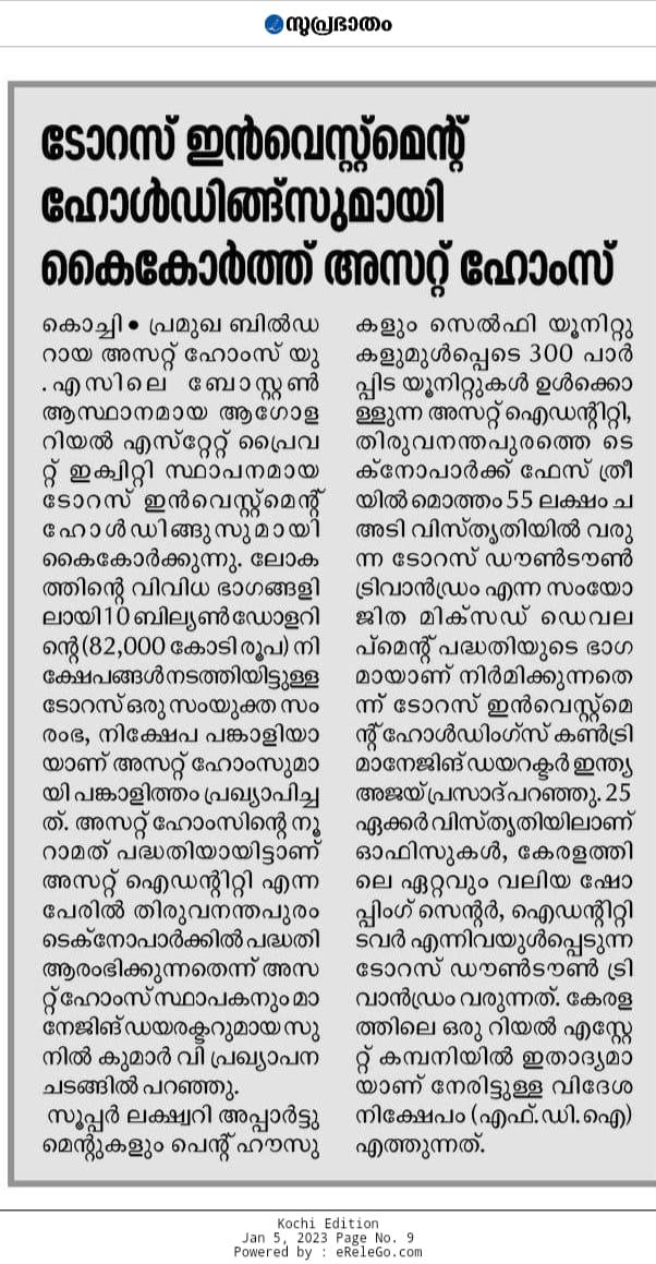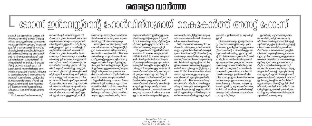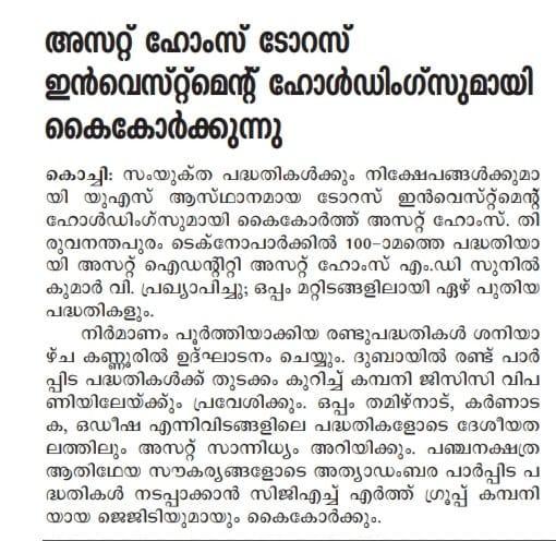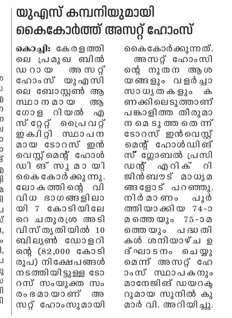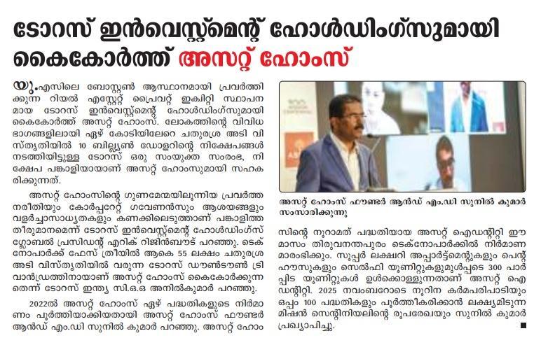 Asset Homes, the leading residential developer in Kerala, has formed a partnership with Taurus Investment Holdings, a global real estate private equity investment and development firm based in Boston, USA. Taurus, which has made over $10 Billion (INR 82,000 Crores) in investments spanning more than 70 million (7 Crore) square feet of assets across the world, has joined hands with Asset Homes both as a joint venture partner and investor. This is the first time that a Kerala-based real estate company has attracted foreign direct investment (FDI).