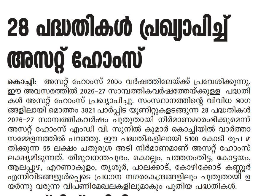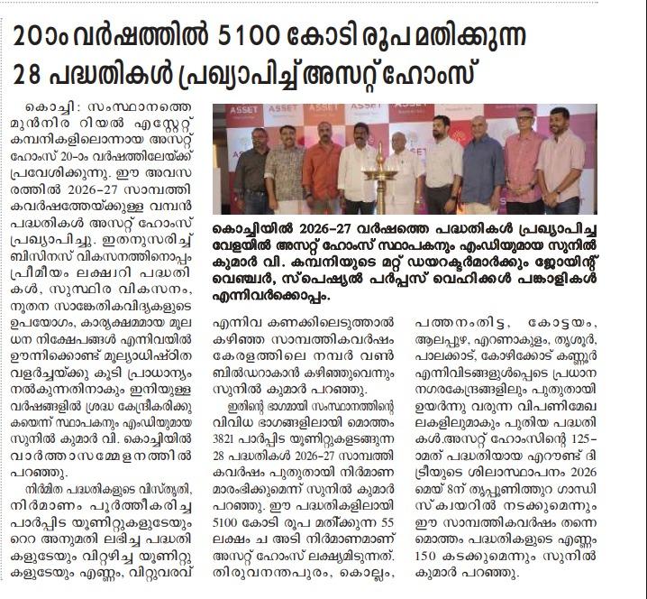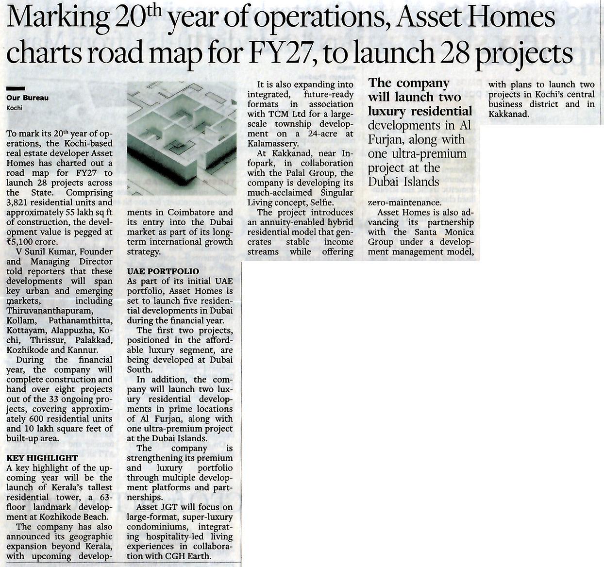 Marking its 20th year, Asset Homes has announced its FY27 roadmap with plans to launch 28 residential projects across Kerala, comprising 3,821 units and approximately 55 lakh sq. ft., with an estimated development value of ₹5,100 crore for FY27. The projects will span key cities in Kerala including Thiruvananthapuram, Kollam, Kochi, Kottayam, Thrissur, Calicut, and Kannur.