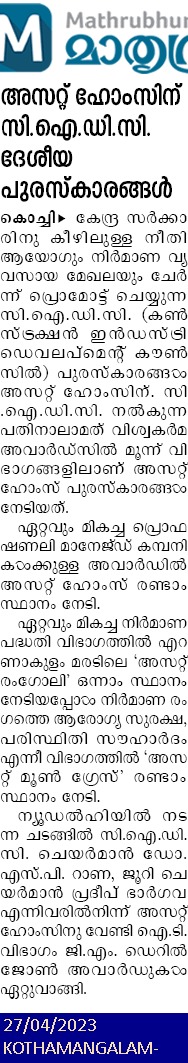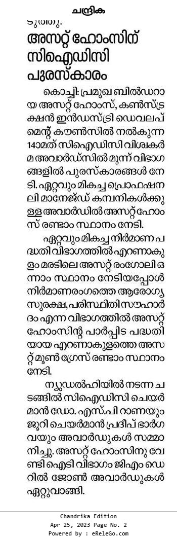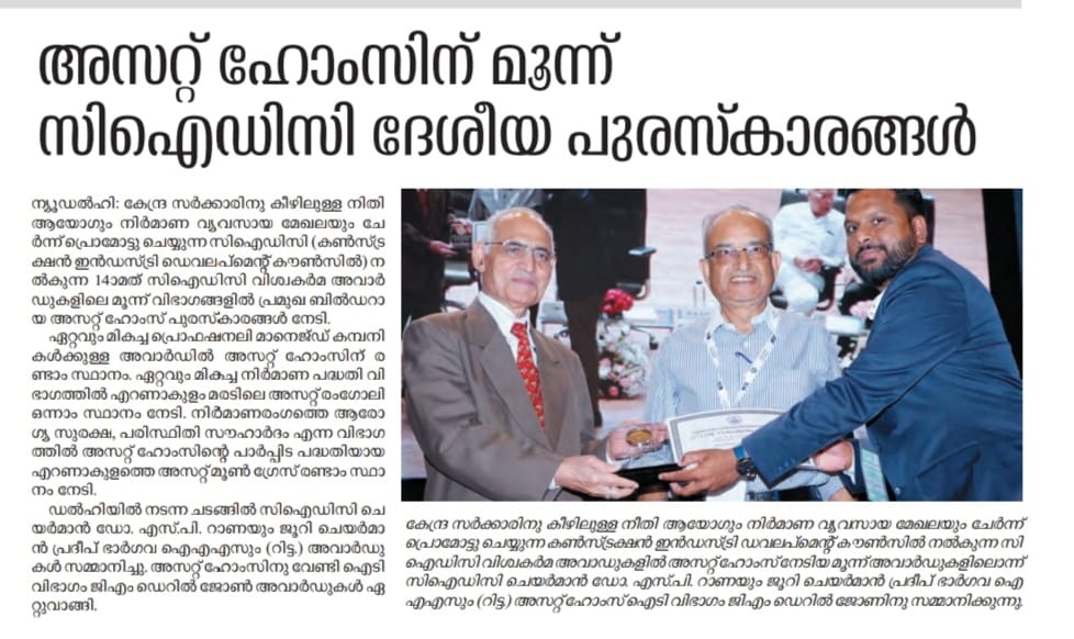 The Asset Rangoli project received the “Best Residential Construction Project" award in recognition of Asset Homes’ commitment to construction excellence. This award recognises the company’s exceptional accomplishment in delivering a high-quality, sustainable, and innovative residential project that meets the evolving needs of today’s homebuyers.