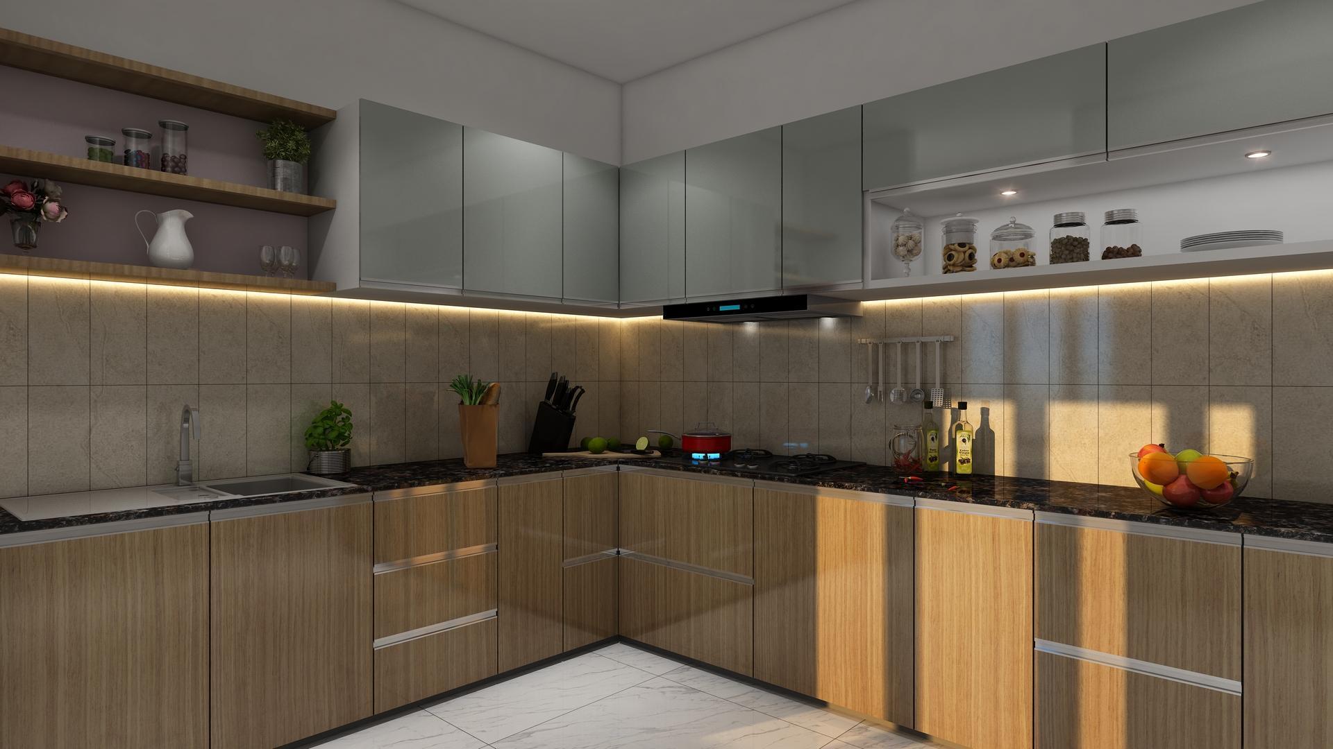Granite/Full body vitrified slab kitchen counter, single bowl stainless steel sink with drain board. Provision for exhaust fan.