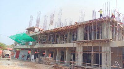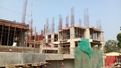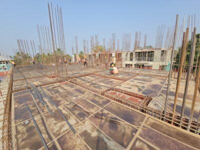 Reinforced cement concrete frame with solid cement blocks infill walls.