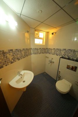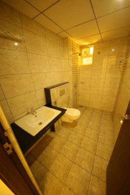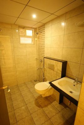 Grade I coloured sanitaryware including European water closet and wash basin. Good quality chromium plated taps, mixer, shower and towel rods.