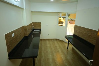 Granite kitchen counter, single bowl stainless steel sink with drain board and tap. Provision for exhaust fan / chimney & hob.