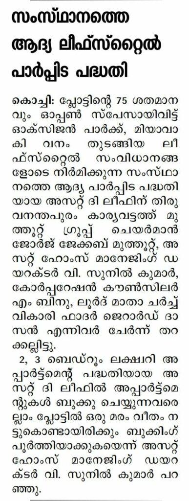 The event began with an address by Fr. Jerard Dasan, who set a reverent tone for the day. Leading the ceremony was Mr. V Sunil Kumar, Founder and Managing Director of Asset Homes. His visionary leadership and dedication to sustainability have been pivotal in the development of Asset The Leaf. He was joined by Mr. George Jacob Muthoot, Chairman of Muthoot Group, and Mr. M Binu, Ward Councillor, whose contributions and support have been vital in the project's progress.