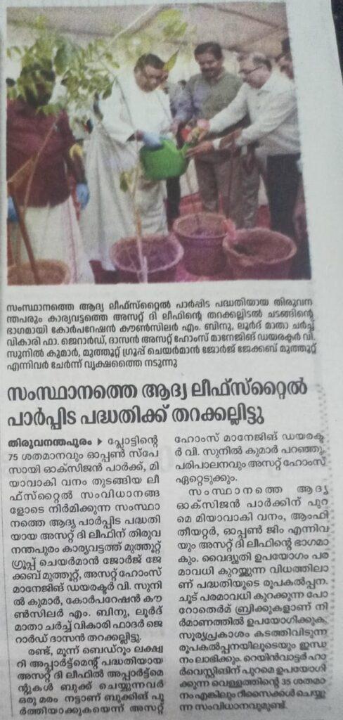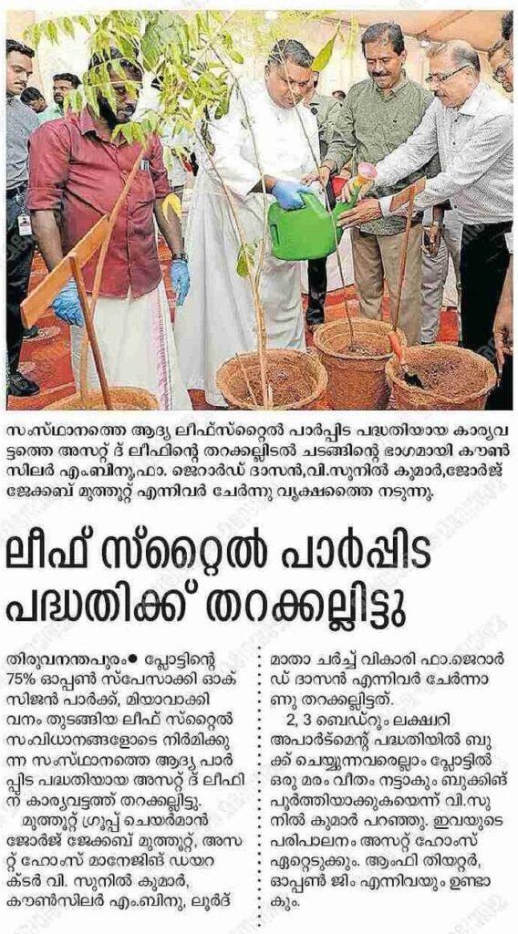 A tree planting initiative was inaugurated by Mr. V Sunil Kumar, Mr. George Jacob Muthoot, Mr. Binu M, and Fr. Jerard Dasan, along with everyone who had booked a residence at Asset The Leaf, symbolizing the project's commitment to environmental sustainability.