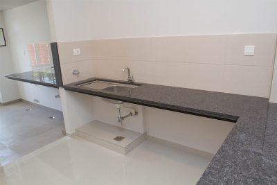 Granite kitchen counter, single bowl stainless steel sink with drain board Provision for exhaust fan