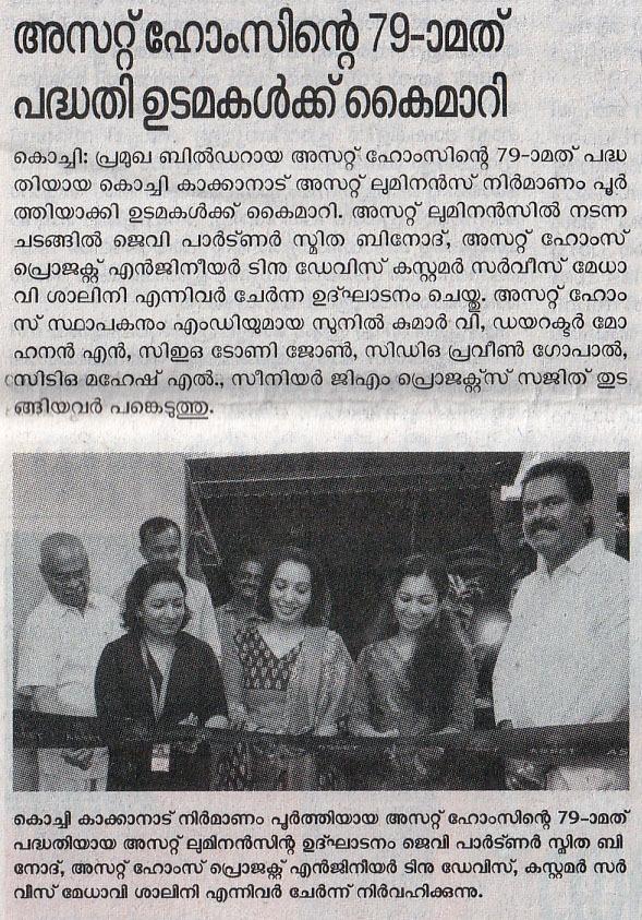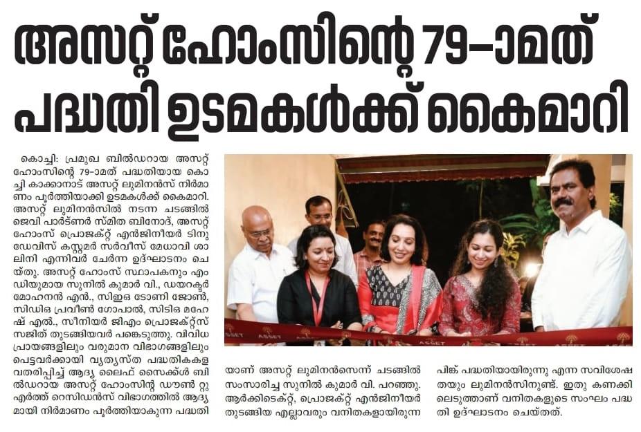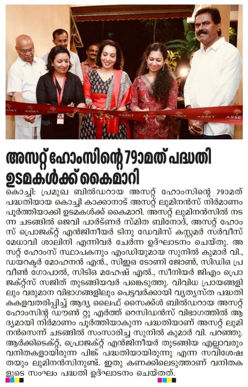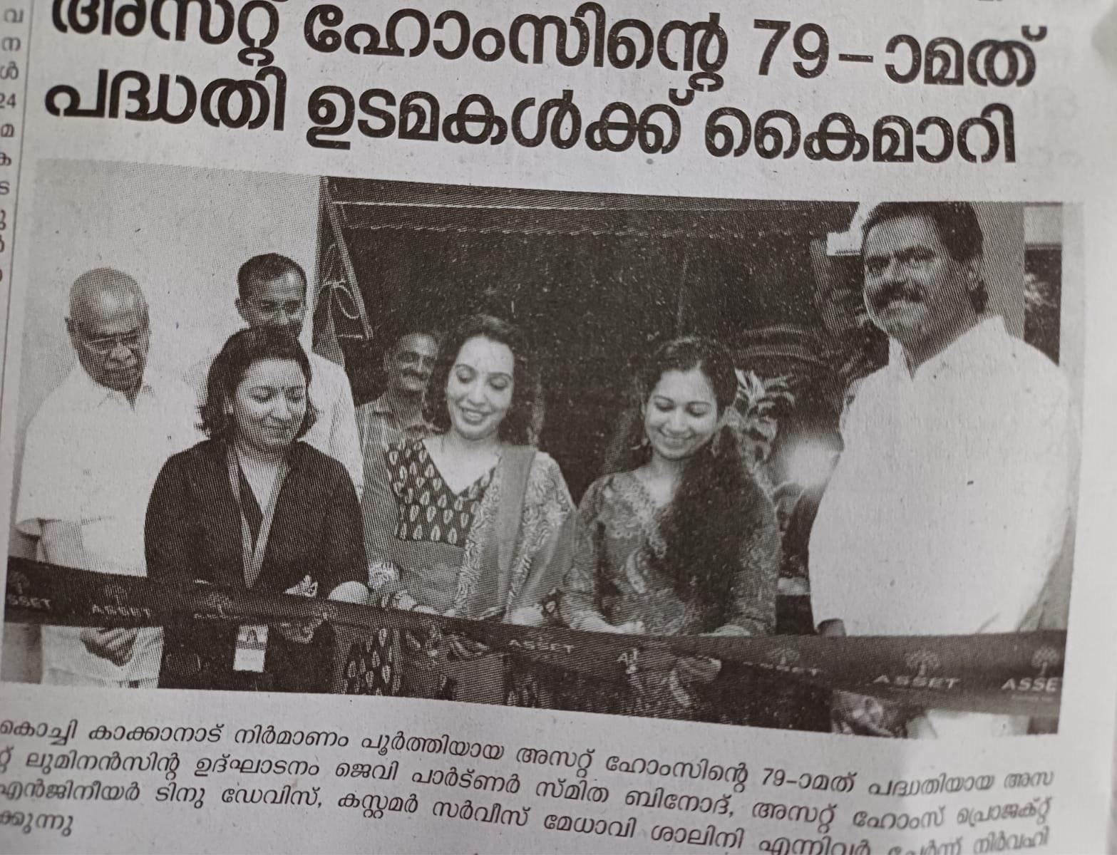 We are excited to announce the successful handover of Asset Luminance, our 79th project in Kakkanad, Kochi! This remarkable project, part of our Pink Initiative, was proudly designed and executed by an all-women team, including JV Partner Smita Binod, Project Engineer Tinu Davis, and Customer Service executive Shalini P S . Asset Luminance marks our first 'Down to Earth' residence, catering to diverse age and income groups, offering a balanced and enriched lifestyle. This innovative concept is now available in Kochi and will soon expand to Kottayam.
