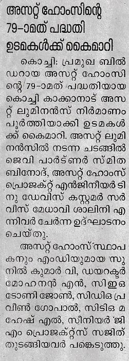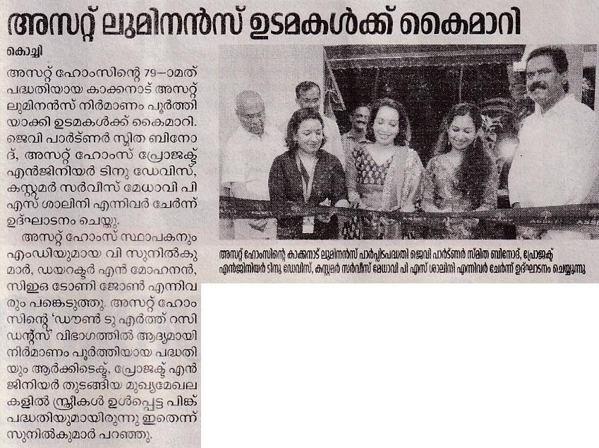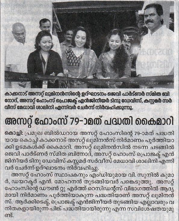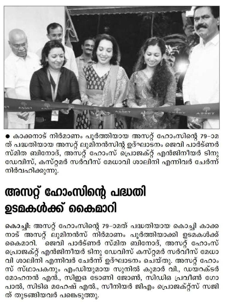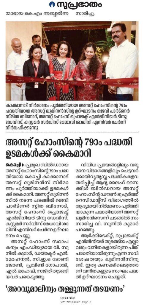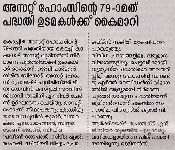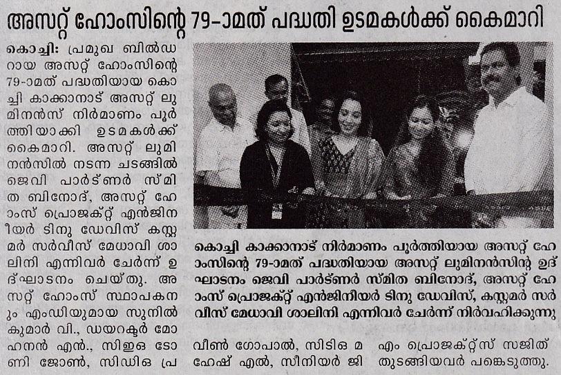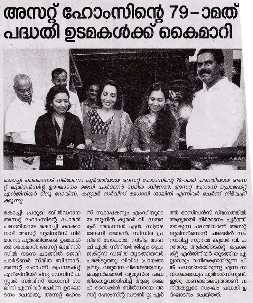 We are excited to announce the successful handover of Asset Luminance, our 79th project in Kakkanad, Kochi! This remarkable project, part of our Pink Initiative, was proudly designed and executed by an all-women team, including JV Partner Smita Binod, Project Engineer Tinu Davis, and Customer Service executive Shalini P S . Asset Luminance marks our first 'Down to Earth' residence, catering to diverse age and income groups, offering a balanced and enriched lifestyle. This innovative concept is now available in Kochi and will soon expand to Kottayam.
