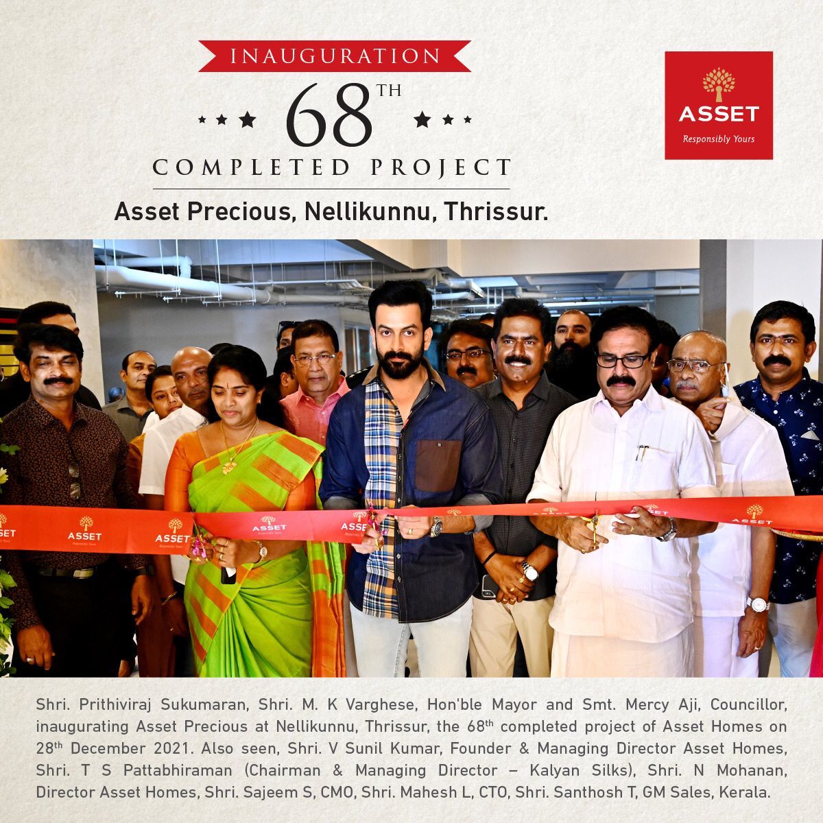 Shri. Prithiviraj Sukumaran, Shri. M. K Varghese, Hon'ble Mayor and Smt. Mercy Aji, Councillor, inaugurating Asset Precious at Nellikunnu, Thrissur, the 68th completed project of Asset Homes on 28th December 2021. Also seen, Shri. V Sunil Kumar, Founder & Managing Director Asset Homes, Shri T S Pattabhiraman (Chairman & Managing Director – Kalyan Silks), Shri. N Mohanan, Director Asset Homes, Shri. Sajeem S, CMO, Shri. Mahesh L, CTO, Shri. Santhosh T, GM Sales, Kerala.
