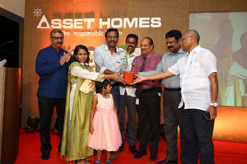 Inauguration of `Treedhan` by Handing over teak sapling by Shri. Reghu Chandran Nair( National Vice President CREDAI) to a new born baby girl and her mother ( Baby Shreya Renjith ,D/O of Dr Renjith and Dr.Aswathy). People on the dias From Right Ar .Madhv Joshi, Mr. V Sunil Kumar,( MD Asset Homes), K Abootty( Senior Vice President ,SUT Hospital),N Mohanan( Director Asset Homes)