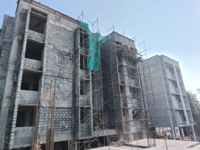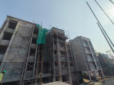 Reinforced cement concrete frame with solid cement blocks in fill walls.