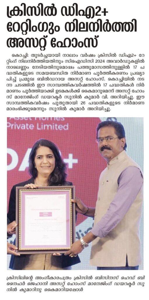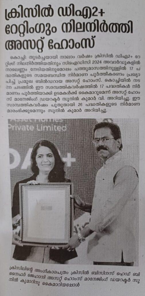 Asset Homes, a premier real estate developer in Kerala, has retained the CRISIL DA2+ rating for the fourth year in a row while Infopark earned A/Stable ratings, winning the recognition for the second consecutive year.