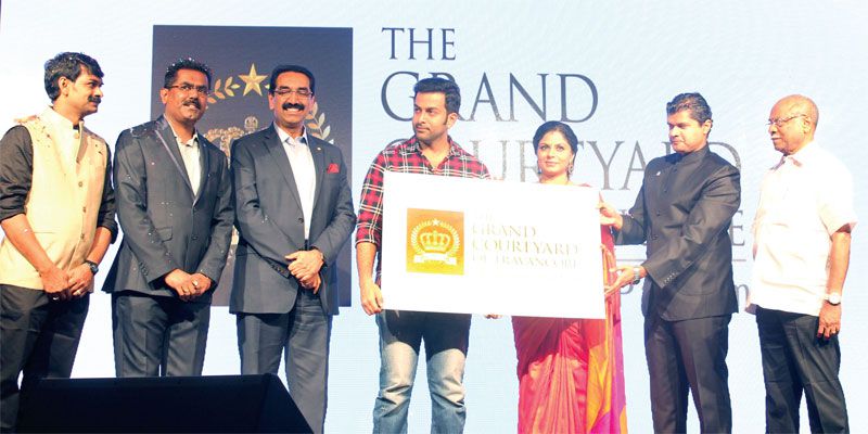Logo of ‘Grand Courtyard of Travancore’, the new limited edition sky villa project of Asset Homes at SUT Campus, Pattom, Trivandrum is being published by film star Prithiviraj, Asha Shrath, UAE exchange president Sudheer Shetty, NMC healthcare corporate affairs presidentNirmal Sheety. Also seen are Asset Homes MD V. Sunil Kumar, Director N Mohanan and CMO Sajeem.