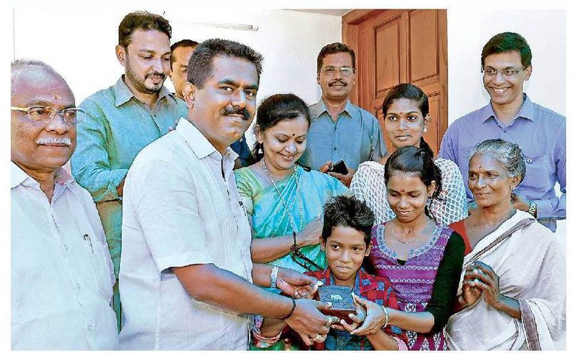 Mr. Sunil Kumar, MD of Asset Homes is handing over the key of the house constructed by Asset Homes to the three ill-fated children.