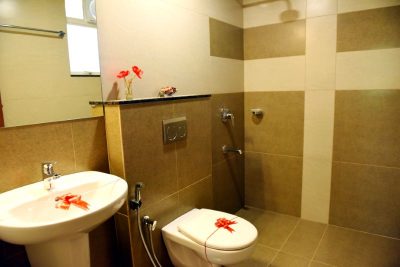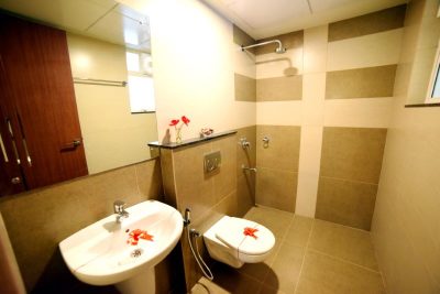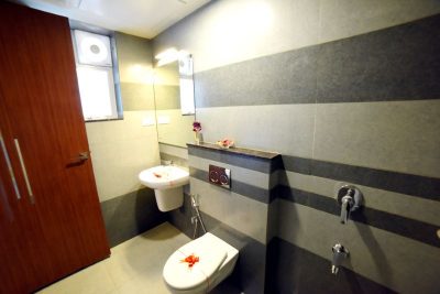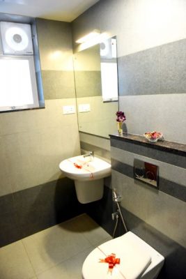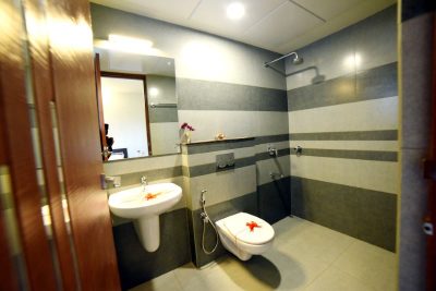 Designed ceramic / glazed wall tile cladding in bathrooms up to false ceiling height.