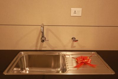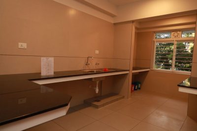 Granite kitchen counter, single-bowl stainless steel sink with drain board. Provision for exhaust fan.