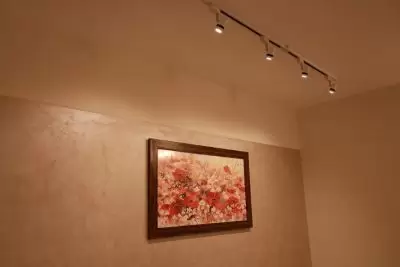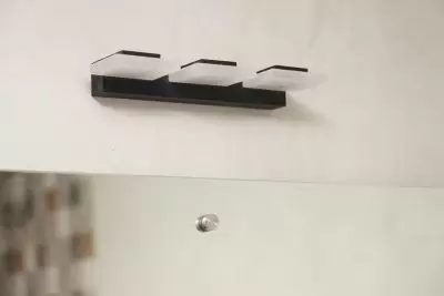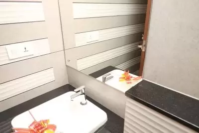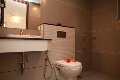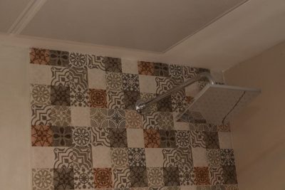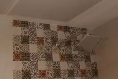 Designed ceramic/glazed wall tile cladding in bathrooms up to false ceiling height.