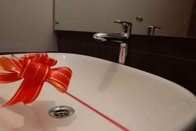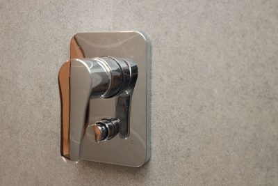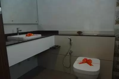 White sanitary ware including European water closet and wash basin. Good quality chromium plated taps, mixer, and shower. Towel rods.