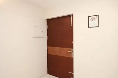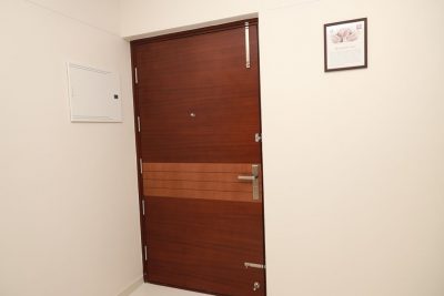 Decorative panelled entrance door in engineered wood. Moulded/ flush doors for bedrooms and toilets