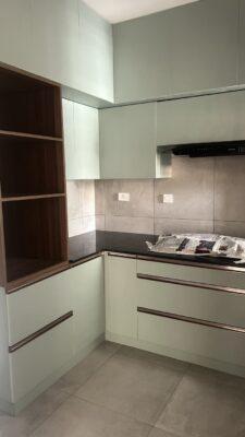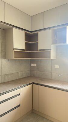 Bare kitchen with full tiling till ceiling height with sufficient power and water points