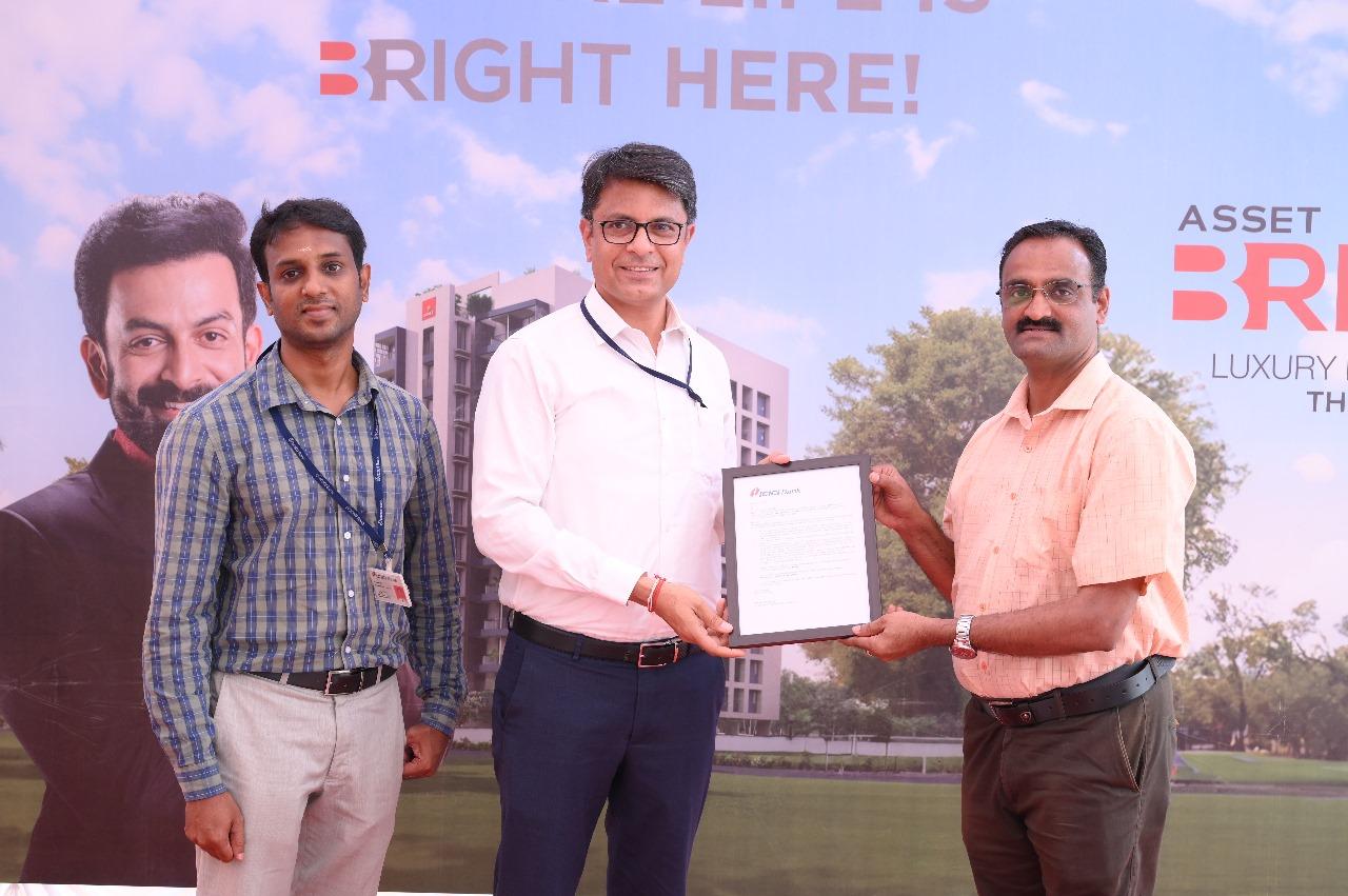 The project approval letters were handed over by various key figures, including Mrs. Renjini, AGM at The State Bank of India, to Mr. Tony John, CEO of Asset Homes; Mr. Muthukrishnan, Branch Head at HDFC, to Mr. Pravin Gopal, CDO at Asset Homes; Mrs. Jisha Jose, Senior Manager at BOB, to Mr. Gokul Pillai, CBO at Asset Homes; Mr. Abhilash, Divisional Manager at Canara Bank, to Mr. Mahesh L, CTO at Asset Homes; Mr. Satheesh Kumar, Regional Head, Mr. Maneesh Mohan RLP Head, and Mr. Sajith Marketing Manager of Union Bank, to Mr. Santhoh T, GM Branch Operations; Mr. Sreenadh, Regional Head at ICICI, to Mr. Sajith, Sr. GM Projects at Asset Homes; Mr. Jojo T John, Territory Manager at Federal Bank, to Mr. Glisson, Chief Engineer at QEST.