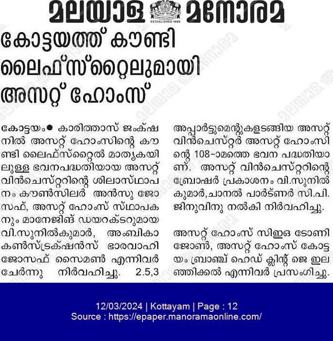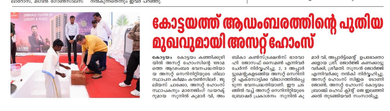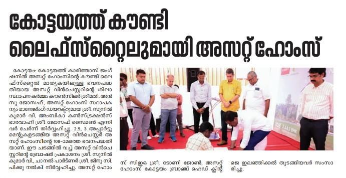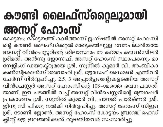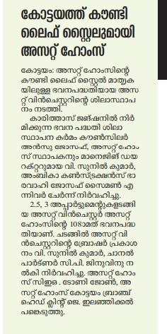 The foundation stone Asset Winchester, the county-style residential project by Asset Homes at Caritas Junction, Kottayam, was laid jointly by Councillor Mrs. Ansu Joseph, Founder and Managing Director of Asset Homes Mr. Sunil Kumar V, Mr. Joseph Simon of Ambika Constructions. The 108th project has 2.5 and 3 BHK apartments. Mr. Sunil Kumar V handed over the first copy of the brochure of Asset Winchester to Channel Partner Shri. Jinu C P. Asset Homes CEO Mr. Tony John welcomed the gathering and Asset Homes Kottayam Branch Head Mr. Clint J Elanjical proposed the vote of thanks.