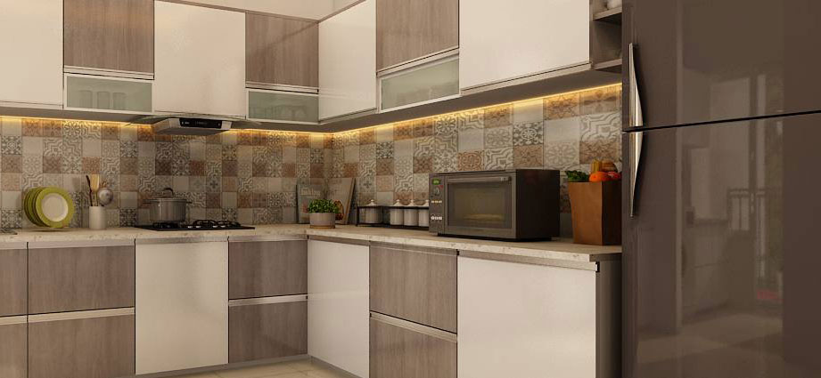 Designed wall claddings with ceramic/glazed wall tiles in bathroom upto false ceiling height. Ceramic tiles till 2ft from counter top for kitchen and wash counters.