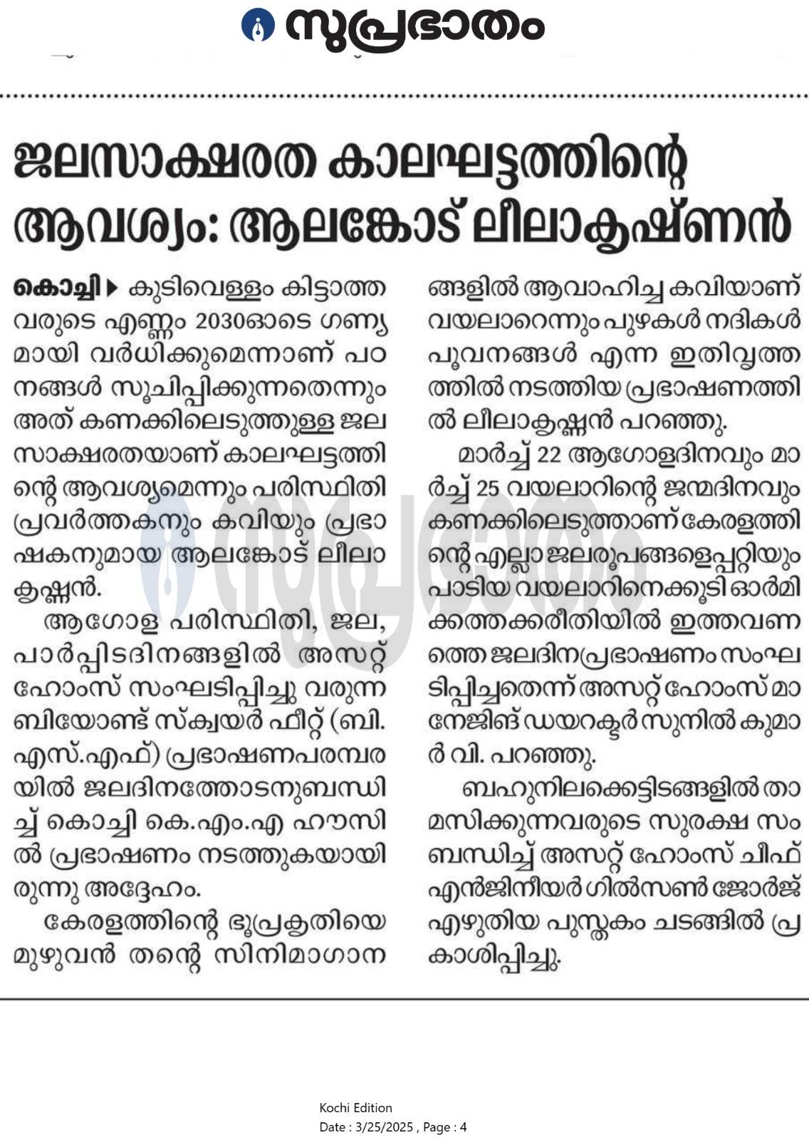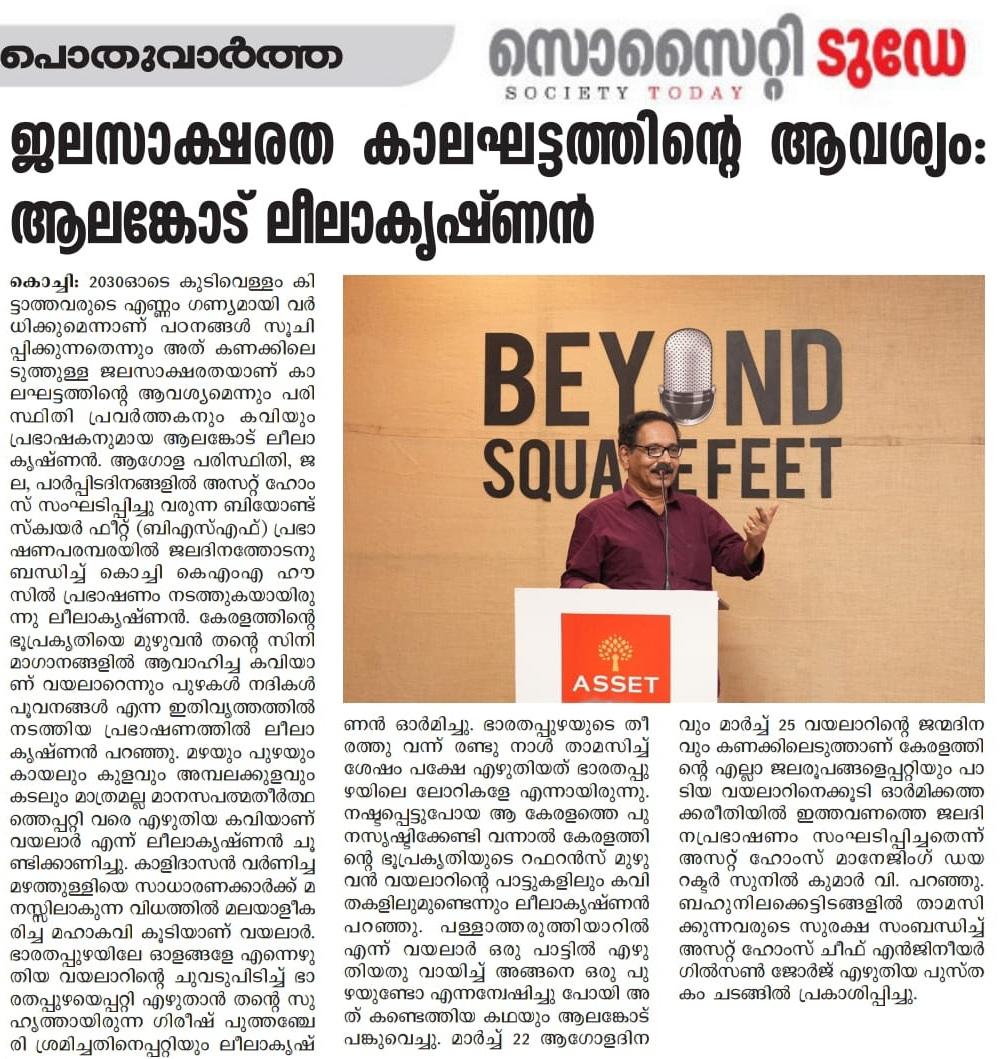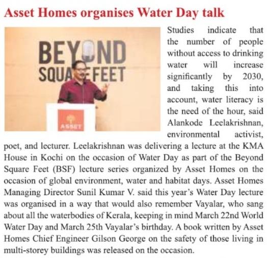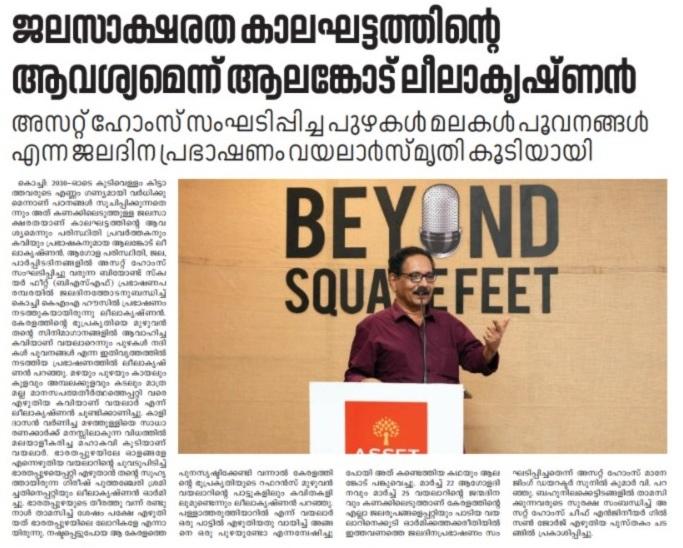Water literacy is the need of the hour, as studies indicate that the number of people without access to drinking water will rise significantly by 2030, said environmental activist, poet, and lecturer Alankode Leelakrishnan. He was delivering a lecture at the KMA House in Kochi as part of the 30th edition of the Beyond Square Feet (BSF) lecture series organized by Asset Homes on the occasion of World Water Day. The lecture, titled Rivers, Mountains, Forests, also served as a tribute to renowned poet Vayalar Ramavarma, aligning with both World Water Day on March 22 and Vayalar’s birthday on March 25.