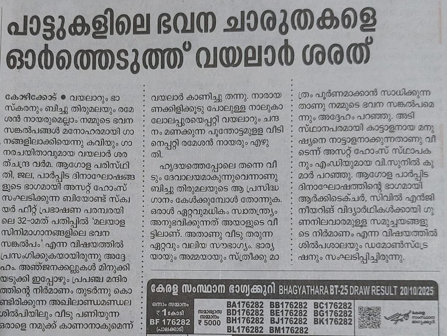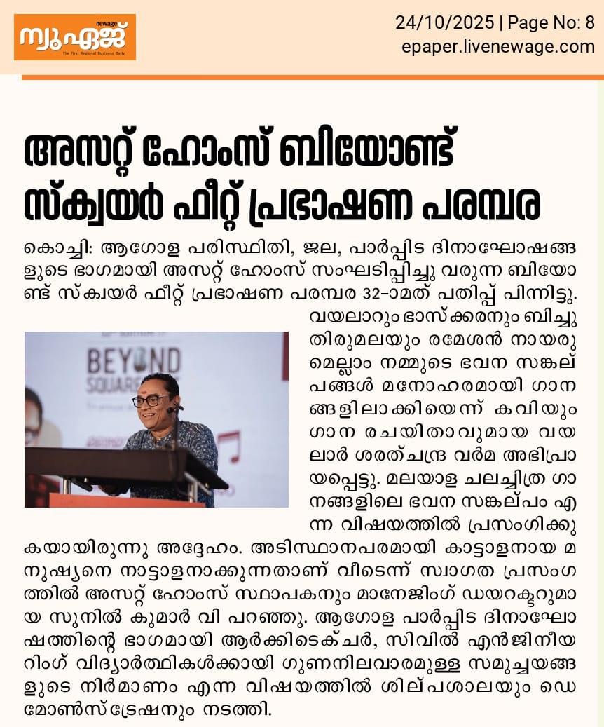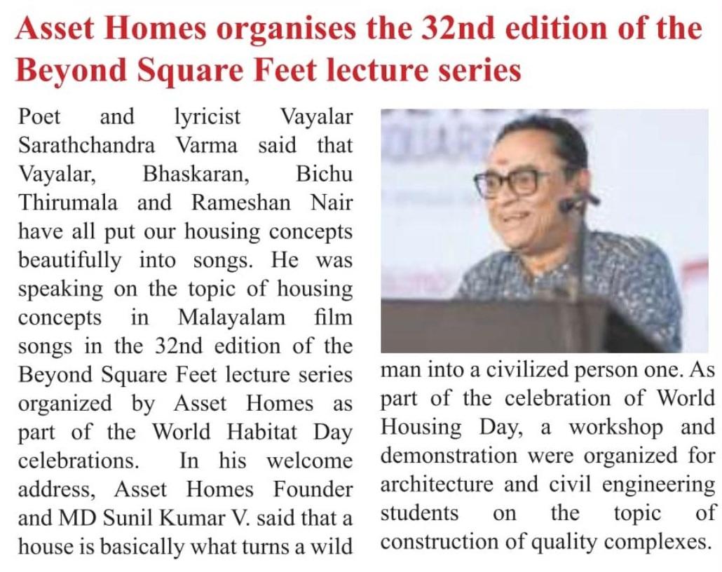 Homes transcend their physical structure of walls and roofs, embodying emotions, memories, and dreams. This profound perspective was eloquently articulated by renowned poet and lyricist Vayalar Sarath Chandra Varma during the 32nd edition of the Beyond Square Feet Lecture Series. The event, organised by Asset Homes as part of the World Habitat Day celebrations, offered an insightful exploration into the poetic dimensions of home.